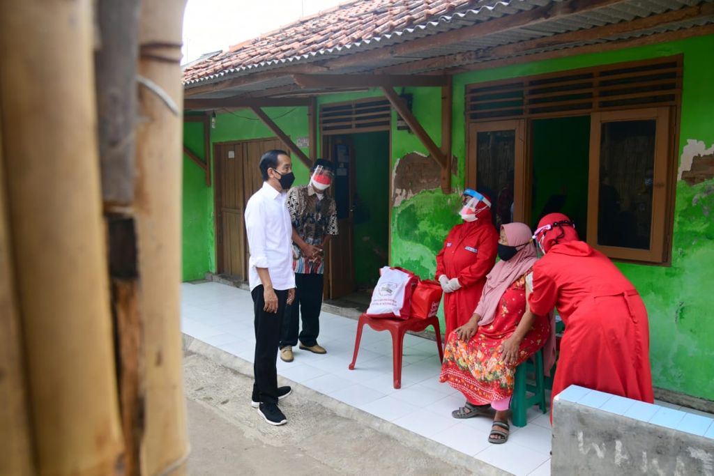 Jokowi ke Jawa Barat dalam rangka Kunjungan Kerja (Kunker). Di Kampung Pengampaan itu, Jokowi meninjau pelaksanaan vaksinasi COVID-19 yang dilakukan secara pintu ke pintu dengan target 500 warga.